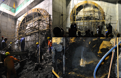 22日,中鐵二局和中鐵七局注定是耐心等待的一天,明明盾構(gòu)機(jī)聲隔墻傳來,聲音悶悶的,但始終不能見面。下午1點(diǎn)多,原本預(yù)計(jì)可“破墻”而出的盾構(gòu)機(jī)還有點(diǎn)“羞答答”的。作為“接收”方的中鐵七局去年12月份已經(jīng)做好了預(yù)留封口的加固,整個(gè)加固層達(dá)到了80厘米厚,全部使用鋼筋混凝土澆筑。負(fù)責(zé)隧道施工的中鐵二局項(xiàng)目部副經(jīng)理李富強(qiáng)介紹, 從蘇州樂園正式動(dòng)工計(jì)算,到昨天,剛好一年差一天,如果從“鉆地虎”盾構(gòu)機(jī)“進(jìn)洞”開始算,是142天,“可以說,等了142天,大家又再次看見了盾構(gòu)機(jī)的刀鼻子了。 ”