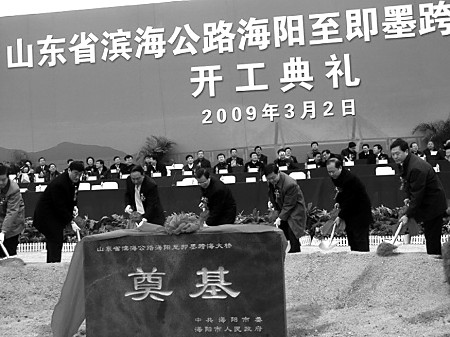 海陽至即墨跨海大橋與海陽核電、海陽港、第三屆亞洲沙灘運動會場館建設并列為海陽市“四大重點工程”,是山東省濱海公路海陽段的重要組成部分。山東省濱海公路海陽段東接威海市濱海公路終點,經跨海大橋過即墨栲栳島與青島市濱海公路北段相連,全長59公里。全線設特大橋一座,大橋6座,平面交叉25處。該項目2009年開工建設,計劃2011年竣工通車,項目建設資金約12億元。