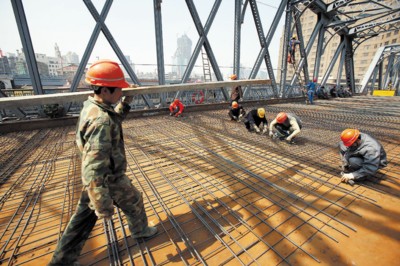 外白渡橋橋身近日正式貫通,施工人員昨天鋪扎鋼筋,為即將進行的混凝土澆筑做準備。如果天氣好,再過兩天左右,整座橋面就可澆筑混凝土。在混凝土牢固后將鋪設一層瀝青,兩側的人行道將同時鋪上木板,恢復百年前最初的樣式。