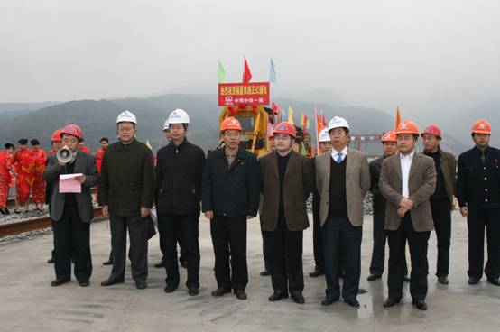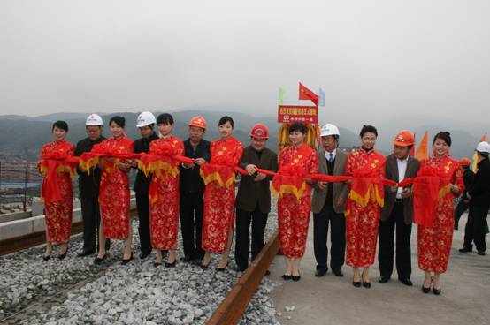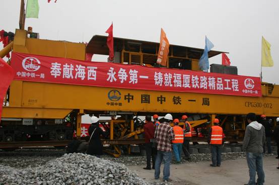 2009年3月8日,福州市鼓山腳下福廈鐵路樞紐閩江特大橋上,舉行福廈鐵路簡(jiǎn)單的鋪軌儀式。上午 9 :08時(shí),隨著東南沿海鐵路福建公司總經(jīng)理陳乃武“鋪軌開(kāi)始!”的一聲令下,在一陣陣鞭炮和汽笛聲中,一臺(tái)標(biāo)有“中國(guó)中鐵一局”字樣的CPG500型長(zhǎng)軌條鋪軌機(jī)組開(kāi)始緩緩向前行進(jìn),并沿著兩根500米長(zhǎng)軌條均勻地將一根根混凝土軌枕布設(shè)在路基上,這標(biāo)志著我公司承擔(dān)的福廈鐵路正式開(kāi)始鋪軌。福建省、福州市重點(diǎn)辦、鐵辦以及東南沿海鐵路福建公司和中鐵一局領(lǐng)導(dǎo)參加了開(kāi)鋪儀式。集團(tuán)公司副總經(jīng)理郭秀春、新運(yùn)公司黨委副書(shū)記、紀(jì)委書(shū)記鄭樹(shù)祥被邀請(qǐng)出席慶典。