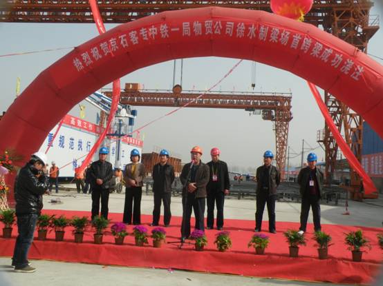 京石客專項目經(jīng)理部常務(wù)副指揮長李冬立出席了開工典禮并宣布首跨箱梁正式開盤。李冬立對徐水梁場進場晚、建場快,在較短時間內(nèi)實現(xiàn)第一跨箱梁預(yù)制目標,取得了階段性優(yōu)異成績表示祝賀。并希望徐水梁場全體員工發(fā)揚中鐵一局“誠信創(chuàng)新、永爭一流”的企業(yè)精神,科學組織、優(yōu)化施工、細化目標、落實責任、爭創(chuàng)精品工程和亮點工程,全面完成任務(wù),為中鐵一局又好又快發(fā)展做出新的貢獻。