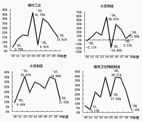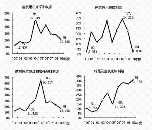 在建材工業中主要行業中,今年1-2月份水泥制造業增長13.7%,水泥制品增長11.5%,建筑衛生陶瓷增長5.2%,建筑用石增長20.9%,建筑技術玻璃增長1.8%,玻璃纖維制品增長16.3%,磚瓦及建筑砌塊增長41.4%。建材主要行業除磚瓦及建筑砌塊繼續保持較快增長外,多數行業前兩個月的增長都是近年來最低水平,其中出口比重較大的建筑技術玻璃、建筑衛生陶瓷和玻璃纖維制品增速下降尤為明顯。