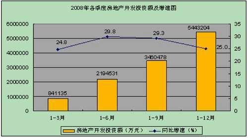 1、房地產開發投資保持穩健發展態勢。1-12月,全省房地產開發投資額544.32億元,比上年增長25.0%;比2007年房地產開發投資額凈增108.86億元;全年房地產開發投資額波峰值與波谷值相差7.1個百分點,總體上呈現穩健發展態勢。從投資類型結構采看,住宅投資444.72億元,比上年增長25.5%;辦公樓投資4.61億元,比上年增長43.0%;商業營業用房投資46.68億元,比上年增長18.1%;其他投資48.31億元,比上年增長25.6%.