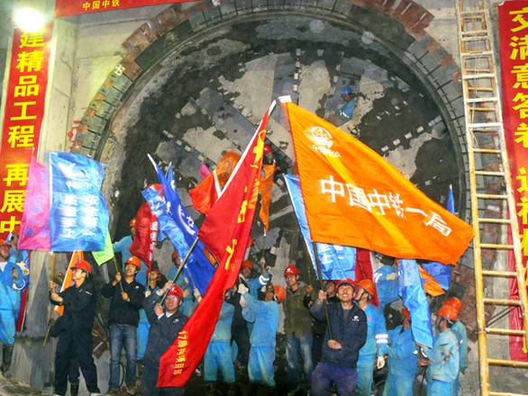 盾構露出刀盤后施工人員舉彩旗歡呼情景