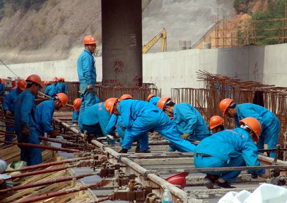 工人們正在進行道床施工