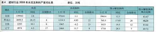 全省2008年水泥產(chǎn)量為2059.3萬噸,同比增長23.64%,高于全國平均水平,排名為第4位。51戶水泥熟料生產(chǎn)企業(yè)產(chǎn)量為1219.5萬噸,同比增長4.95%,低于全國平均水平,在全國排名為第22位。對比如表4:
