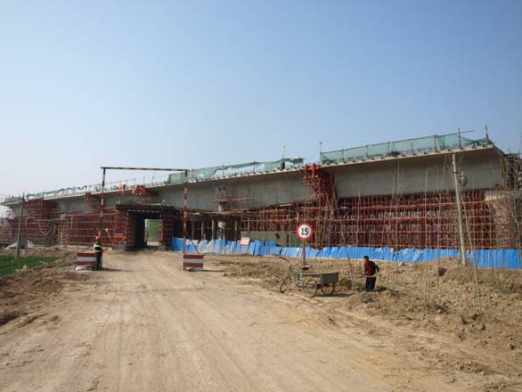 該項目部結合該橋跨公路的特點,開展了“規范安全質量行為年”宣誓和簽字活動,搭設了結實的安全防護棚、增加了安全防護設施、警示標志,并配備專職交通指揮員進行交通疏導;項目部采取月檢、旬檢加不定期抽檢的方式,加大安全檢查監督,及時整改完善。并在施工現場設置安全員,現場盯控,消除了安全隱患。為加快施工進度,滿足先期架梁方向的大局要求,項目部積極開展了“學習實踐科學發展觀、打好施工攻堅戰”活動,針對該橋工期緊迫的狀況,春節過后,項目部將施工作業人員由該橋原定的30多人增加到80人,并配置了兩套模板加快周轉,安排了項目班子成員現場監管、督戰。
