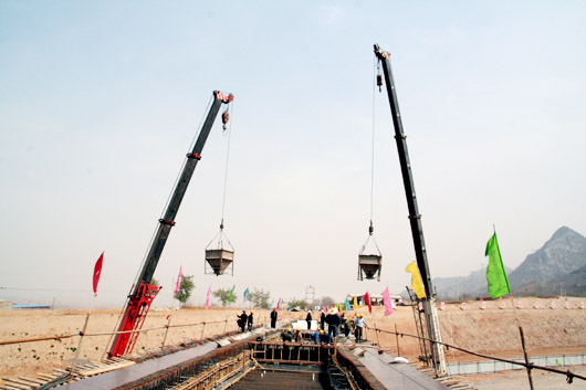 該天橋位于該項目鼓山隧道口附近,是該項目部的一形象工程,所以項目領導對第一次澆筑非常重視。為了安全優質地順利完成澆筑,經過一個多月對人員、物資、設備等的精心準備后,于4月6日下午正式開始澆筑。在整個澆筑過程中,項目領導、技術員、試驗員和質檢員現場全過程值班監控澆筑。在近20個小時的緊張施工后,順利完成了該天橋從第一跨到第六跨底板和腹板的砼澆筑,并受到了業主和總監辦的高度贊揚:“你們組織安排有序,指揮得力,又打了一個漂亮仗,真不愧為鐵軍勁旅”。