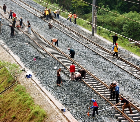 截止目前,達成西段共完成鋪軌150.55公里、軌枕錨固160.35公里、鋪碴145.5公里、整道265公里、焊軌87KM、鋪道岔29組。
