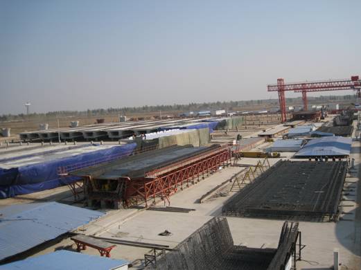 技術創新、加快施工進度。京滬各梁場在嚴格執行現場質量管理制度、工序質量責任制,關鍵工序質量保證措施的同時,積極開展技術創新活動,采用新工藝、新工法和梁體質量通病預防措施,不但提高了工程質量,而且提高了工效,加快了施工進度。在梁身鋼筋綁扎施工中,在濟南指揮部和局項目部的指導幫助下,對箱梁預應力孔道實行定位工法,對定位網進行改造,方便了管道順直固定,使加工制作和安裝預應力網片簡捷方便,將工效提高了將近一倍;對端模進行了改造,在錨穴外沿設置一定的弧線段,既方便了端模拆除,又保證了梁體端頭外觀質量;對梁體混凝土澆注施工方法進行技術創新,總結出對于大噸位大體積箱梁混凝土灌注的最優方案,減少了梁體空洞發生;為了消除梁體混凝土氣泡質量通病,項目部嚴格控制混凝土的坍落度,有效減少了氣泡,保證了混凝土強度。同時還對了克服支座板空響、橋面六面坡的施工工藝進行了優化,有力的保障了施工的質量和進度,受到局項目經理部和濟南指揮部的書面表揚。