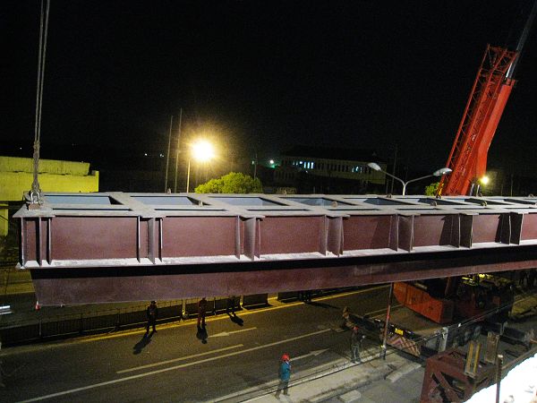 項目部秉承“安全防范精細到位,質量管理精益求精,環境保護精心操作,成本控制精打細算”的管理方針,扎實落實安全第一、預防為主”的指導思想,在跨線墩施工期間,積極和當地交警、路政、電力公司等相關部門組織協調,做好管線搬遷、施工組織設計和交通疏解工作,加強質量控制,由指揮部和項目部領導牽頭組織對施工方案進行專家評審,并嚴格安全技術交底制度,由項目部總工程師親自到現場進行安全技術交底,對開展形式多樣的安全培訓教育活動。通過全體員工的共同努力,針對下步鋼梁架設過程中可能出現的安全問題制定出詳細周密的施工方案,利用夜間車輛相應較少時段進行施工,請交警協助維護交通秩序,在得到交警部門施工組織方案審批后,4月27日展開了鋼梁架設工作。