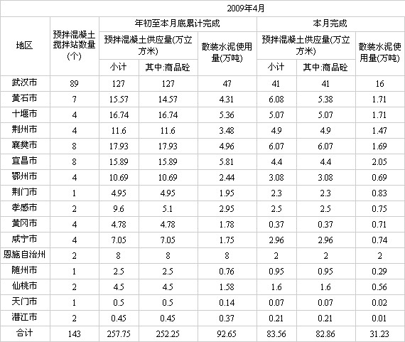 湖北2009年4月預(yù)拌混凝土供應(yīng)量數(shù)據(jù)