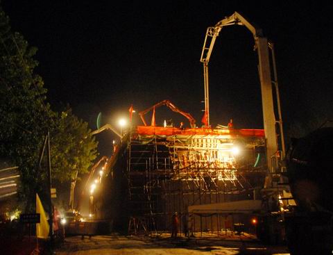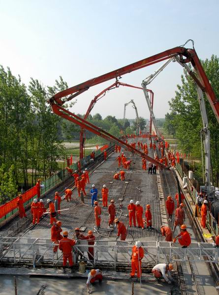 為使現澆梁順利澆筑,在施工前該單位就做了精心準備和具體部署。一是召開八丈溝澆筑前施工準備會。集團公司副總經理兼京滬高鐵指揮部指揮長、黨委書記習仲偉和常務副指揮長張玉軍等指揮部領導到會并提出具體安排,要求對技術和現澆梁施工人員進行全面培訓及到別的單位進行觀摩學習,使得每一位員工在思想上引起高度重視,明確自己所在崗位的重要性及在施工過程中要掌控的關鍵環節。二是制定了專項施工技術方案和準備。七公司副總經理兼京滬高鐵項目部經理許滌非、項目書記董恩情、總工王繼東等率領項目部一班人馬按照局指揮部的要求,精心組織,合理分工,從混凝土澆筑前對支架、模板、鋼筋和預埋件的全面檢查,到振動棒的移動間距,以及混凝土收漿抹面的人工拉毛、養生等進行詳細的分工和安排,并是制定了專項安全措施,成立安全領導小組,專門設計安全欄桿、腳手板、爬升梯和安全網,施工現場設置隔離欄桿和醒目的標志牌、限速牌,夜間設置指示燈等,并成立了后勤保障組以及時為施工人員送上可口的飯菜。