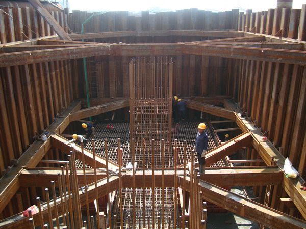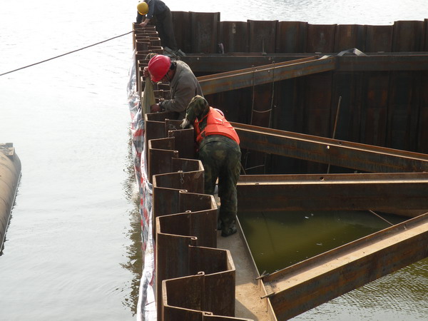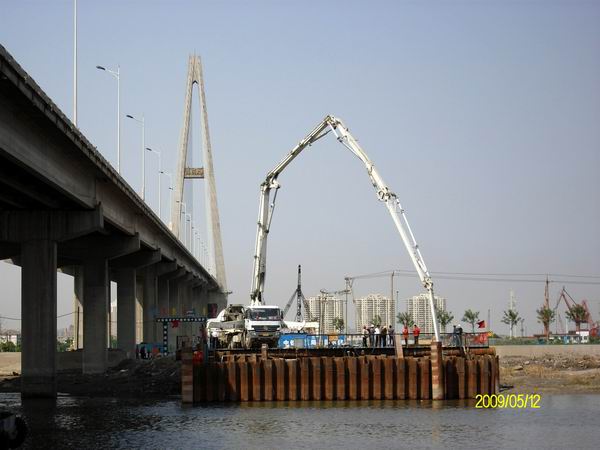 海河大橋是天津集疏港公路二期中段1標段的主要工程之一,全長2033米,下部結構共有41個墩臺,其中有12個橋墩位于海河河道水中,最大水深達8米。水中橋墩基礎設計均為鉆孔樁、低樁承臺,基礎承臺要埋入河床泥土之中,承臺基坑從水面到基底開挖深度為5米至11米。水中橋墩承臺施工技術控制難度高、安全風險大、作業面狹小,是海河大橋施工的重點控制工序。施工采用15米至18米長的卡扣式鋼板樁圍堰、高壓射水吸泥開挖、大塊組合鋼模板、泵車輸送混凝土入模等先進施工技術,有效保證了施工順利進行。