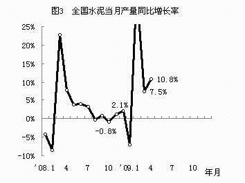 1-4月份全國水泥產量4.29億噸,比去年同期增長10.2%;4月份當月全國水泥產量1.47億噸,比去年同月增長10.8%(見圖3)。去年8月份至年底,全國水泥當月產量陷入零增長,今年2月份全國水泥產量月同比增長率曾達到34.9%,是因為去年年初南方冰凍雨雪災害同期基數偏低的緣故,今年4月份全國當月水泥產量月同比增長率,實際上是去年8月份全國水泥產量增速下滑以后的最高增長速度。