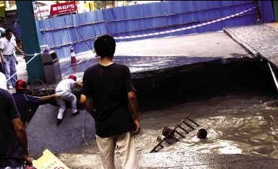 下午記者在現(xiàn)場(chǎng)看到,海印電器總匯二場(chǎng)外墻的廣告牌凸出,數(shù)名地鐵施工人員正用鐵板圍住下沉的路面,多名人員進(jìn)入下沉路面勘探。到下午3時(shí)17分,記者突然聽(tīng)到“轟”的一聲巨響和“啊”的一聲尖叫,抬頭望去,只見(jiàn)路面升起一股煙霧并濺起3米高的水花,隨后聞到一股濃烈的煤氣味。地鐵施工人員、自來(lái)水公司員工和市場(chǎng)保安全都跑向下沉路段,并疏散附近市民。記者看到,下沉路面裂開(kāi)一個(gè)大洞,面積約30平方米、深約2米。塌方處積滿污水,一名施工人員連同路面一起掉了進(jìn)去,數(shù)分鐘后,該人員被拉上路面,并無(wú)大礙。“幸虧他綁著安全帶,不然必死無(wú)疑。”一名施工工人說(shuō)。