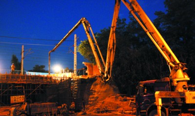 8月11日晚6時,兩臺混凝土泵車同時開始首次澆注。由于香爐礁立交橋在鐵路橋南北兩側有4根橋墩礙事,新橋將分兩次進行澆注。首次預制新橋將耗用800立方米、約2000噸的混凝土,新橋骨架使用了300噸的鋼筋。