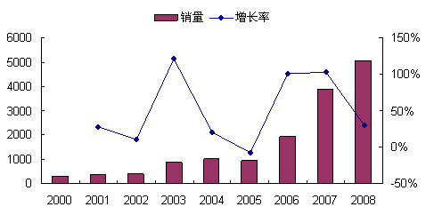 圖1 2000-2008年中國混凝土泵車銷量情況