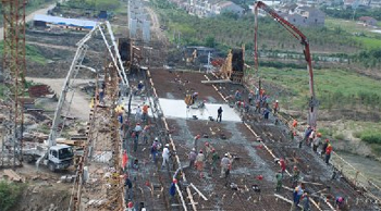 京滬高速鐵路跨德勝河系桿拱橋是一座跨徑為100m的系桿拱橋。在第一次澆注20m以后,為保證架梁工期,剩余80m系梁采用一次性澆注完成。9月9日上午8時,經過精心組織,精心計劃,由140多人參與的系梁澆注戰斗打響,歷時約30小時的艱辛奮戰,9月10日14時,艱巨的系梁澆注任務終于圓滿完成。系梁實際澆注C50混凝土方量為1591m3。