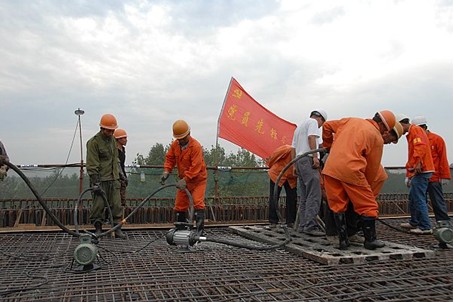 9月12日—13日的澮河現(xiàn)澆梁澆筑現(xiàn)場呈現(xiàn)出壯觀、緊張而又秩序井然的景象。“黨員先鋒號”、“青年突擊隊”和“工人先鋒號”等旗幟現(xiàn)場隨風(fēng)飄揚,近300人活躍在連續(xù)梁澆筑的各個崗位和各道工序上,四臺大型混凝土泵車和近30臺混凝土罐車參與了戰(zhàn)斗。