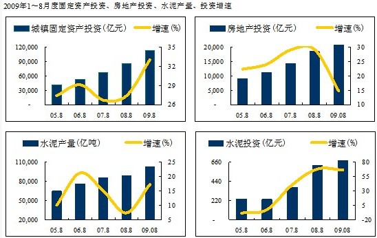 4萬億基礎(chǔ)設(shè)施建設(shè)投資以及其他“一攬子”經(jīng)濟(jì)刺激計劃,極大地帶動了固定資產(chǎn)投資的增長。從前8個月的數(shù)據(jù)來看,我國城鎮(zhèn)固定資產(chǎn)投資增速迅猛上升,累計投資總量突破歷史新高:1~8月份,完成固定資產(chǎn)投資112,984.79億元,同比增長33%。