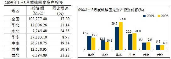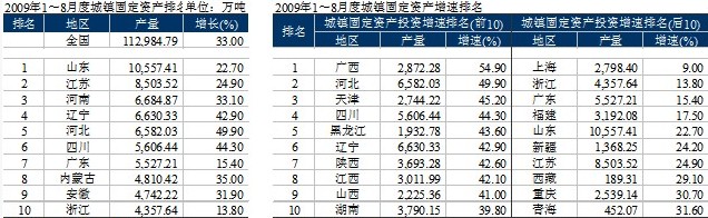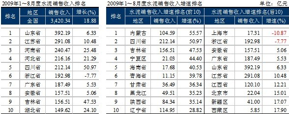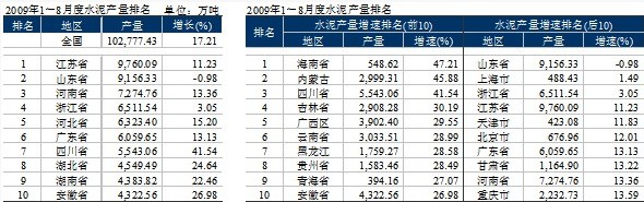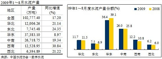 數(shù)據(jù)顯示,2009年1~8月全國完成水泥投資1,031.94億元,同比增長66.3%。增長率雖與去年同期持平,但仍處于高增長區(qū)間。西南地區(qū)投資累計增速居于首位,達(dá)到了158%;高于全國水平的還有華北、西北地區(qū),增速分別是73.46%、79.07%;東北、華東、中南地區(qū)低于全國水平,增速分別是26.32%、50.3%、33.5%。