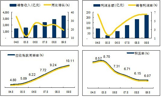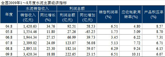 年初以來實(shí)施的一攬子刺激經(jīng)濟(jì)計劃效果有所顯示,經(jīng)濟(jì)從2季度起企穩(wěn)回升,3季度的7、8兩個月加快復(fù)蘇,逐步走出低谷。4萬億投資拉動下,需求超預(yù)期,促使產(chǎn)量增長,銷售收入、利潤總額同步提升。但同時產(chǎn)能快速釋放所帶來的壓力,使行業(yè)的毛利率表現(xiàn)不佳。前期對水泥庫存的消化為傳統(tǒng)四季度旺季的到來奠定了基礎(chǔ),但四季度經(jīng)濟(jì)效益水平提升主要取決于水泥價格提升的后續(xù)動力。
