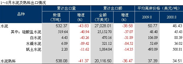 2009年水泥出口依然持續(xù)下滑。1~8月水泥出口量為532.37萬噸,同比下降43.83%;水泥熟料出口量為538.08萬噸,同比下降41.37%。水泥和熟料的離岸價格都有增長,分別上漲9.34%和8.34%。