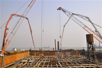 施工中,在通力配合和科學分工協調下,所有施工人員24小時晝夜鏖戰,采用水下全斷面推進法工藝,由兩個兩立方拌合站持續供灰、兩臺泵車、14臺罐車同時參與施工,確保了鋼圍堰封底的順利完成,共澆注C25混凝土2648方,封底高度2.3米,澆注面積達1600平方米,實現了由水下基礎到水上主體工程的過渡和施工條件向可控性轉變,為項目部大干、快上創造了有利的施工條件。