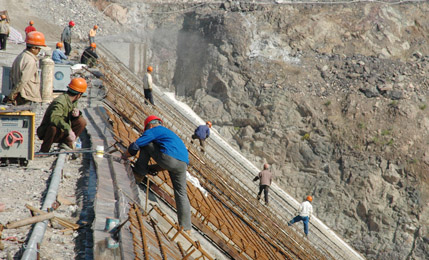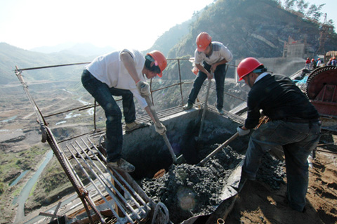 截止目前,大壩壩頂107米高程,壩體填筑、溢洪道、下游河道改道及隧洞工程等全部完成,約完成總工程量的80%左右。為確保2010年4月15日水庫蓄水成功,工程相關各單位、部門將緊盯目標,倒排計劃,集中力量,全力沖刺。圖為施工人員正在進行大壩面板澆筑。