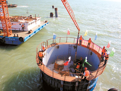 近日,南澳大橋海上首個承臺的樁芯混凝土一次性澆筑成功。此次完成樁芯混凝土澆筑施工的承臺為西引橋深水區(qū)的W85號墩承臺。W85號墩承臺為4樁基礎,樁芯鋼筋籠長7.5米,單個樁芯的混凝土方量為10.6立方米。圖為澆筑成功的鋼管樁填芯混凝土。