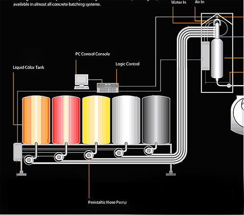 由混凝土配色軟件(Concrete Palette)選定顏色后對邏輯控制器發(fā)出指令,邏輯控制器指揮配電板啟動蠕動軟管泵進(jìn)入混合器混合,可加水和加壓混合,均勻后由蠕動泵直接打倒混凝土攪拌車或混凝土攪拌機(jī)內(nèi)。