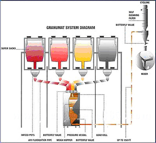 顏料經(jīng)測壓元件計量后,經(jīng)壓送式氣力輸送系統(tǒng)(倉式泵),由旋風(fēng)式分離器將微顆粒分離出來,再卸料至攪拌系統(tǒng)。