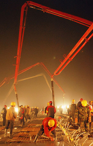 12月9日23時10分,石武客專高場特大橋連續梁,通過中鐵十六局集團公司石武客專二分部全體員工15小時的連續艱苦奮戰,順利澆筑成功。