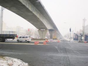 施工情況:規(guī)劃中自由大路與臨河街交會(huì)處的“海關(guān)站”是人員活動(dòng)比較密集的區(qū)域,北方市場(chǎng)、臨河街生產(chǎn)資料市場(chǎng)等大型商場(chǎng)、市場(chǎng)環(huán)繞其左右。目前,自由大路高架橋已架設(shè)完畢,橋下施工初期的水泥石樁已全部拆除,路面狀況恢復(fù)良好?!昂jP(guān)站”輪廓現(xiàn)已初具規(guī)模。