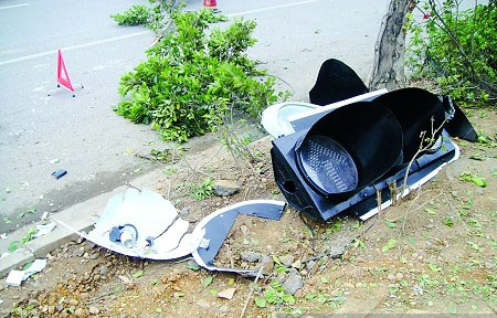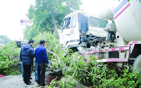 在現場看到該罐車斜停在綠化帶中間,駕駛室里空無一人。圍觀者說,司機在事故發生后不知去向。該罐車前部破損嚴重,擋風玻璃、側窗玻璃破碎。在罐車后大約100米左右的綠化帶小路內,有部分樹木被折斷,還散落著路燈、紅綠燈、車身鐵片等殘骸。