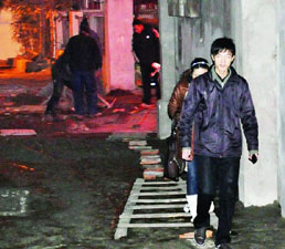 當晚9時許,此時院子里已經鋪上了木板、磚塊以及木梯子供居民行走,施工工人仍在緊張施工。記者看到 ,院子里雖然鋪上了一些腳踏工具,但居民行走起來仍然不是很方便,其中一對年輕人由于腳下不穩險些掉進混凝土中。踩著磚塊進入院子,整個院子里已經全都鋪上了混凝土,而由于鋪上的木板有限,再加上院子里燈光昏暗,一些居民進出時仍然會陷進混凝土之中,平整的混凝土上留下了很多腳印。