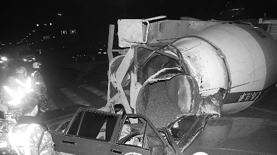 路口中央的情景更讓人吃驚:攪拌車和出租車呈“丁”字形,攪拌車向右側(cè)翻,車尾壓住出租車左側(cè)。出租車已嚴(yán)重扭曲變形,整個(gè)車身被壓癟,輪胎爆裂,玻璃粉碎,車頂也被掀開。