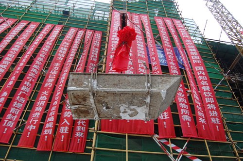在蘇寧電器集團與中建五局的聯合推動下,伴隨著高質量與高品質的建設,威海蘇寧電器廣場于2010年1月8日提前完成了結構封頂,今日上午10:18,特別準備好的鞭炮、禮炮齊鳴,寫滿項目恭賀封頂和項目優勢的紅色橫幅掛滿項目正立面,恭賀項目提前封頂的拱門等也已布置到位。冒著幾十年不遇的暴雪嚴寒,項目提前完成結構封頂距離蘇寧電器廣場在威海的亮相已越來越近。