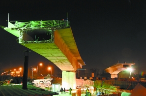 懸澆,即掛籃懸澆,是完全不同于傳統(tǒng)的整體支架現(xiàn)澆方式,將橋體分段“懸空”澆注,掛籃通過滑道向前移動推進(jìn)。采用這種方式,能夠?qū)⑹┕χ苓叚h(huán)境的影響降到最低限度。亦莊線跨五環(huán)路轉(zhuǎn)體橋總長度為165米,由兩座位于亦莊橋西面南北兩側(cè)的橋體構(gòu)成,懸澆施工前后歷時3個月,對五環(huán)路幾乎沒有造成任何影響,道路暢通無阻;而轉(zhuǎn)體橋是運(yùn)用“磨盤原理”,采用由特殊材料制成、非常潤滑的球鉸支架,由千斤頂拖動而轉(zhuǎn)動橋梁。