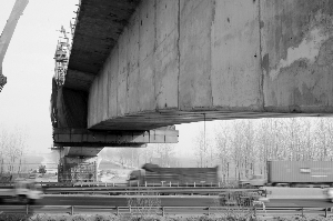 在京石高鐵東白莊跨京石高速公路特大橋施工現場,隨著中鐵十三局的一名工人澆筑完最后一段混凝土,主跨長度為100米的京石客運專線橫跨京石高速公路跨線橋當日順利合龍。目前該特大橋工程進展順利,預計2010年6月全部箱梁將架設完成。