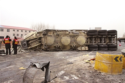 水泥罐車司機的跟車者介紹,這輛車載重70噸,屬于河北唐山某建筑公司,但具體情況不便透露。