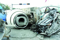 28日上午9時許,深圳南山區沙河西路深圳職業技術學院大門口發生一起車禍,一輛裝滿水泥混凝土的攪拌車剎車失靈,在路口連撞5車后側翻,將正在等紅燈的一輛小轎車壓扁,小轎車內的兩人只受輕傷。