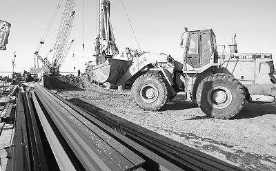 近日,哈爾濱市三環路西線跨松花江大橋施工現場,工人們正進行橋墩的澆注工作,據介紹,大橋北起松北區,向南連接群力新區。橋梁全長6473米,其中主橋長6348米,橋面為雙向八車道,預計2011年末竣工。該橋建成后,將緩解松花江公路大橋的交通壓力。