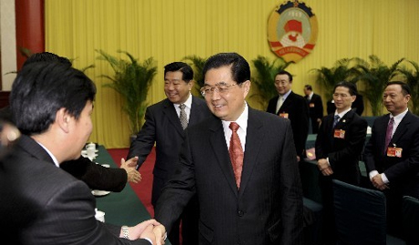 4日下午,胡錦濤與全國政協主席賈慶林來到政協禮堂看望民建、全國工商聯界別政協委員,并與委員們共商國是。