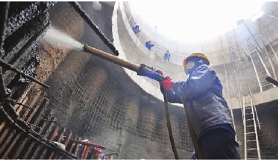 3月9日下午,長沙市傅家洲營盤路隧道施工現場,一名施工人員在向豎井壁噴漿。