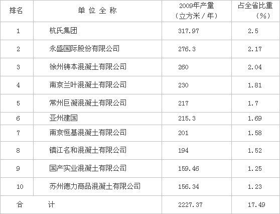 江蘇省2009年混凝土供應量前10名的企業名單 (表2)