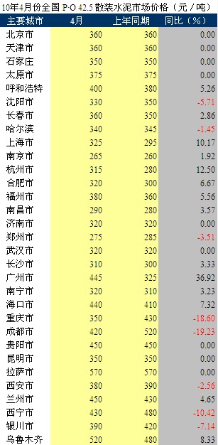 2010年3~4月,全國的天氣變化無常,春寒、陰雨、降雪等天氣反反復(fù)復(fù)。明顯影響了水泥市場需求的恢復(fù),直接造成全國大部分區(qū)域水泥庫存消化的速度同比減緩,也使得整體價格水平在需求季節(jié)未出現(xiàn)明顯上調(diào)跡象。