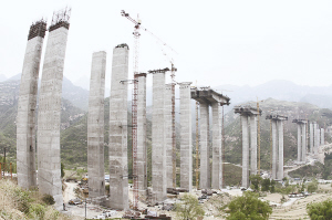 5月27日,在施工現場多座上百米高的橋墩上一派忙碌,建設單位晝夜施工以使這條交通干線早日通車。