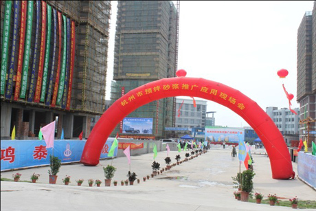 2010年5月26日上午,在彭埠鎮興隆社區農轉居(一期)施工現場,杭州市建設委員會組織召開了“杭州市預拌砂漿應用試點工作現場會”。 出席此次會議的領導有:市建委裘新谷副主任、董天樂處長、市經委樓鳴處長、江干建設局領導、江干管理中心領導、市散裝辦領導、市混凝土管理站領導、市質安監總站領導。出席此次會議的還有各區縣市機關和直屬單位以及各施工企業和新聞媒體共200余人。